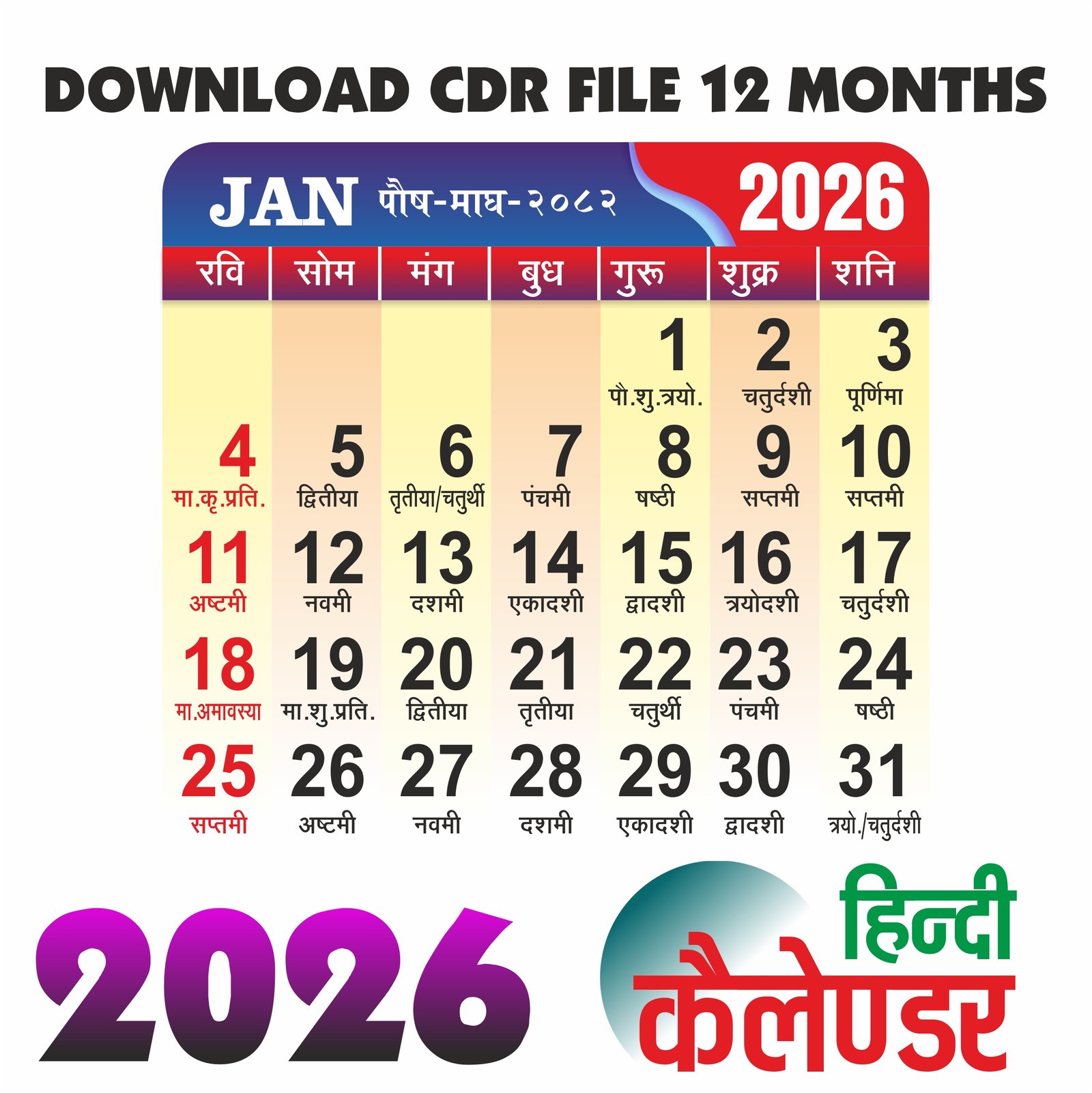 2026 Hindi Calendar CDR File | 2026 New Year Calendar | Panchang 2026 in Hindi